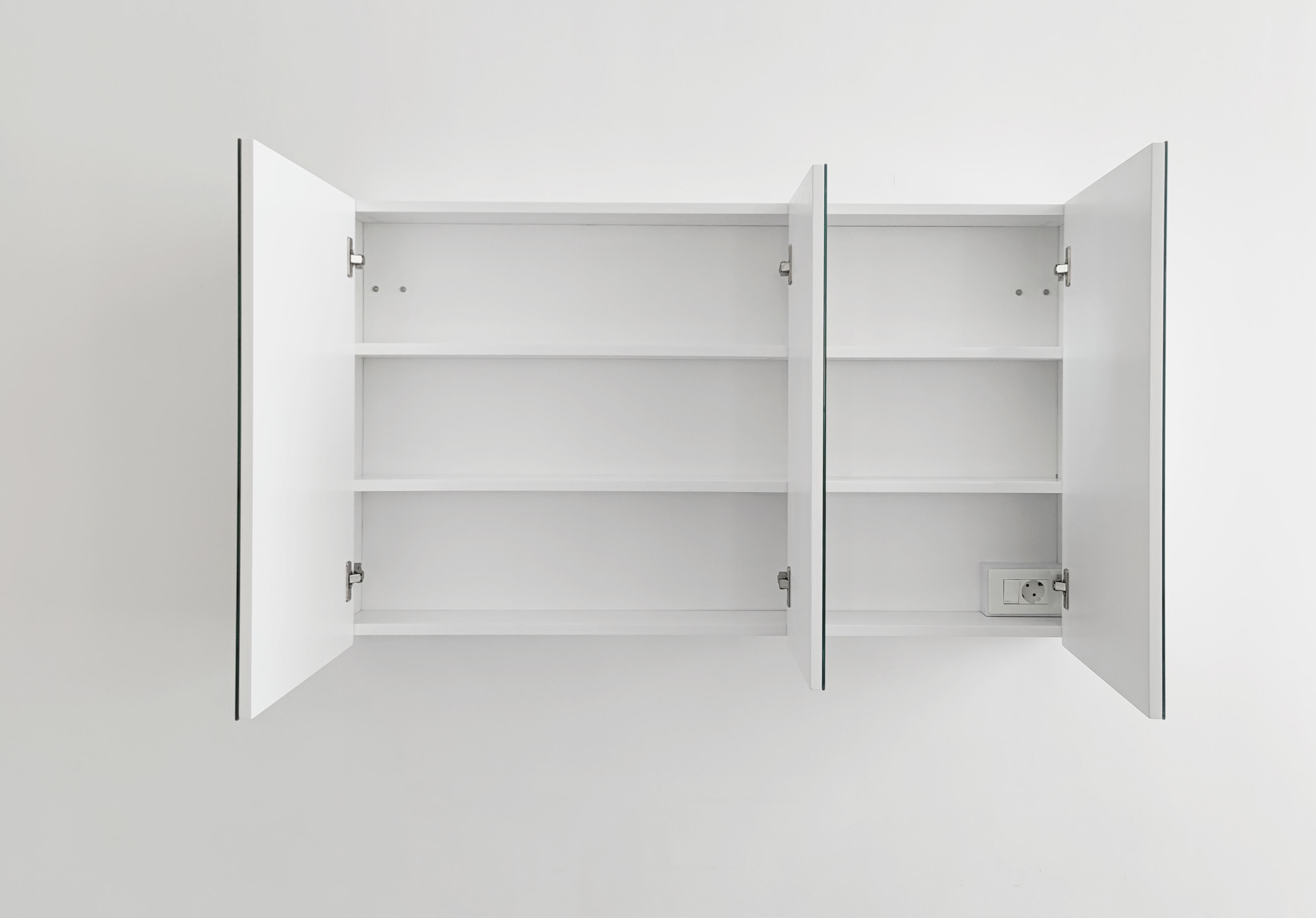 Mit 3 ungleichgroße Spiegeltüren ohne sichtbare Griffe fügt sich der Schrank elegant in die Badezimmereinrichtung ein. Der Innenraum mit zwei Einlegeböden bieten viel Stauraum für Badutensilien. Die 2 seitlich angebrachte LED-Beleuchtungsleiste sorgen für eine gleichmäßige Ausleuchtung und erleichtert die tägliche Pflege und kann bequem über einen Schalter und eine Steckdose gesteuert werden.