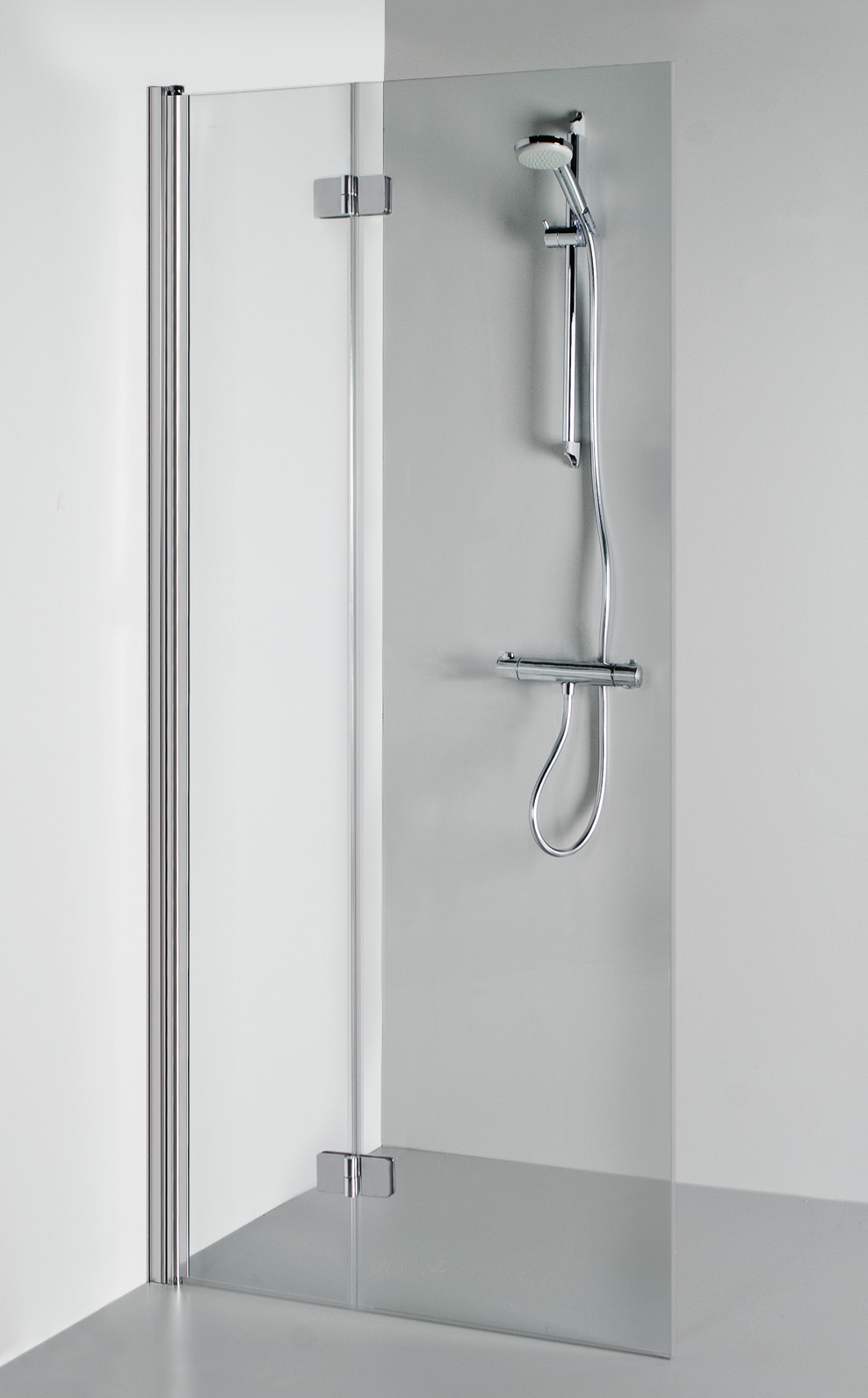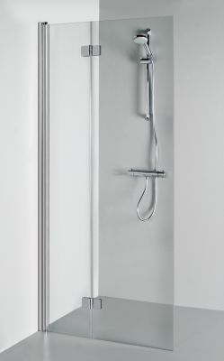 Perfekte Lösung für enge Nischen: Die Tür lässt sich an der Wand zusammenklappen und eröffnet so einen Höchstbreiten-Eingang in den Duschbereich. Ideal auch für Badezimmer mit zu wenig Platz für eine herkömmliche Türöffnung. Ausstattung: 6 mm ESG-Glas, klares Glas mit Anti-Kalk-Beschichtung. Aluminium-Profil Chrom.