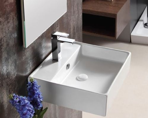 Wand-Waschbecken mit Überlauf und Hahnloch, auch als Aufsatzwaschbecken verwendbar