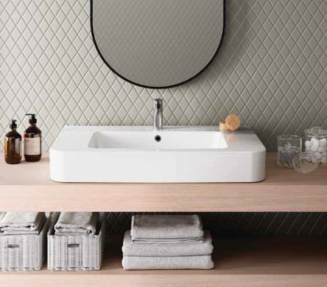 Einbauwaschbecken Velvet mit Überlauf und Hahnloch, auch geeignet für Wandmontage.