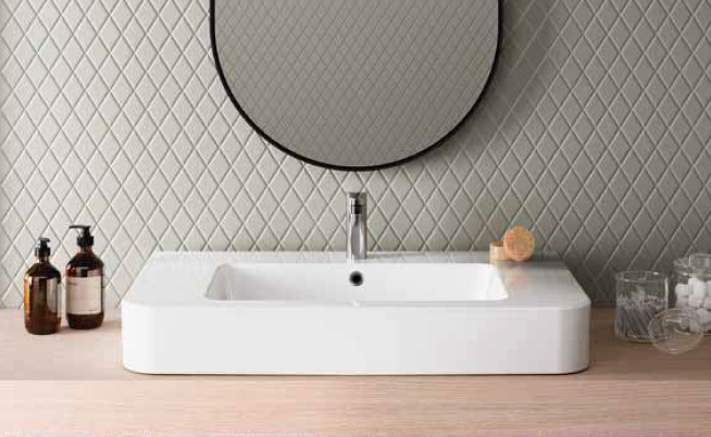 Einbauwaschbecken Velvet mit Überlauf und Hahnloch, auch geeignet für Wandmontage.