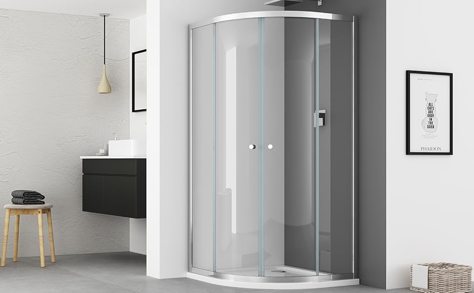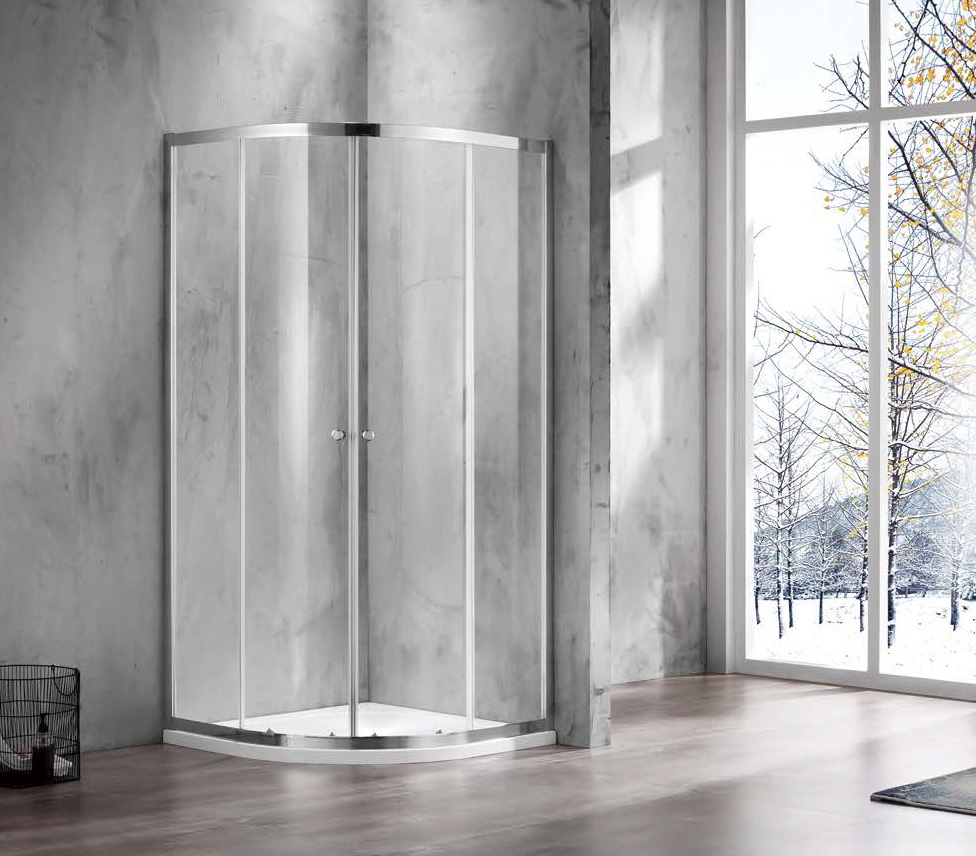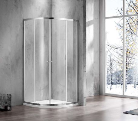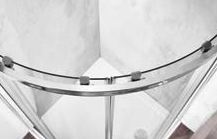 Ausführung: Runddusche mit Schiebetüren, 4-teilig, Radius 550 mm, gefertigt aus 6 mm starkem ESG-Sicherheitsglas in Klarausführung. Die Schiebetüren sind mit Doppelrollen oben und unten ausgestattet und sorgen für eine stabile, leichtgängige Führung.