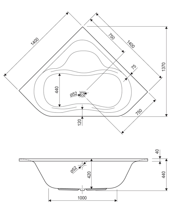 1400x1400x410mm, Volumen 160L