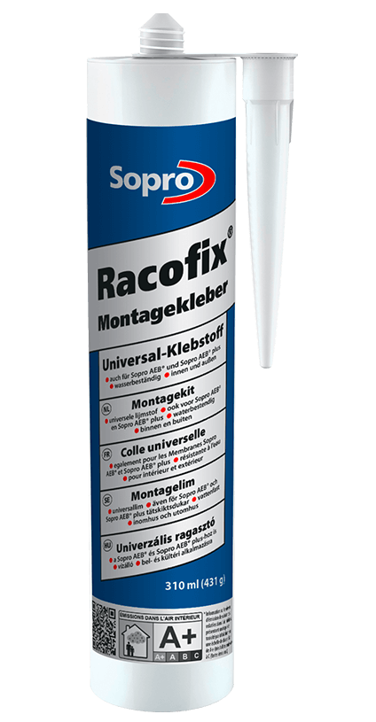 Einkomponentiger, gebrauchsfertiger Universal-Klebstoff auf Polymerbasis. Zur wasserdichten Verklebung der Stöße und Überlappungen der Sopro Abdichtungsbahnen sowie für die wasserdichte Verklebung von Sopro Dichtbändern, Dichtmanschetten und weiteren Formteilen. Zum Verkleben unterschiedlichster Materialien, zum universellen Montieren sowie zum Schließen von Rohrdurchführungen bei Installationsarbeiten.