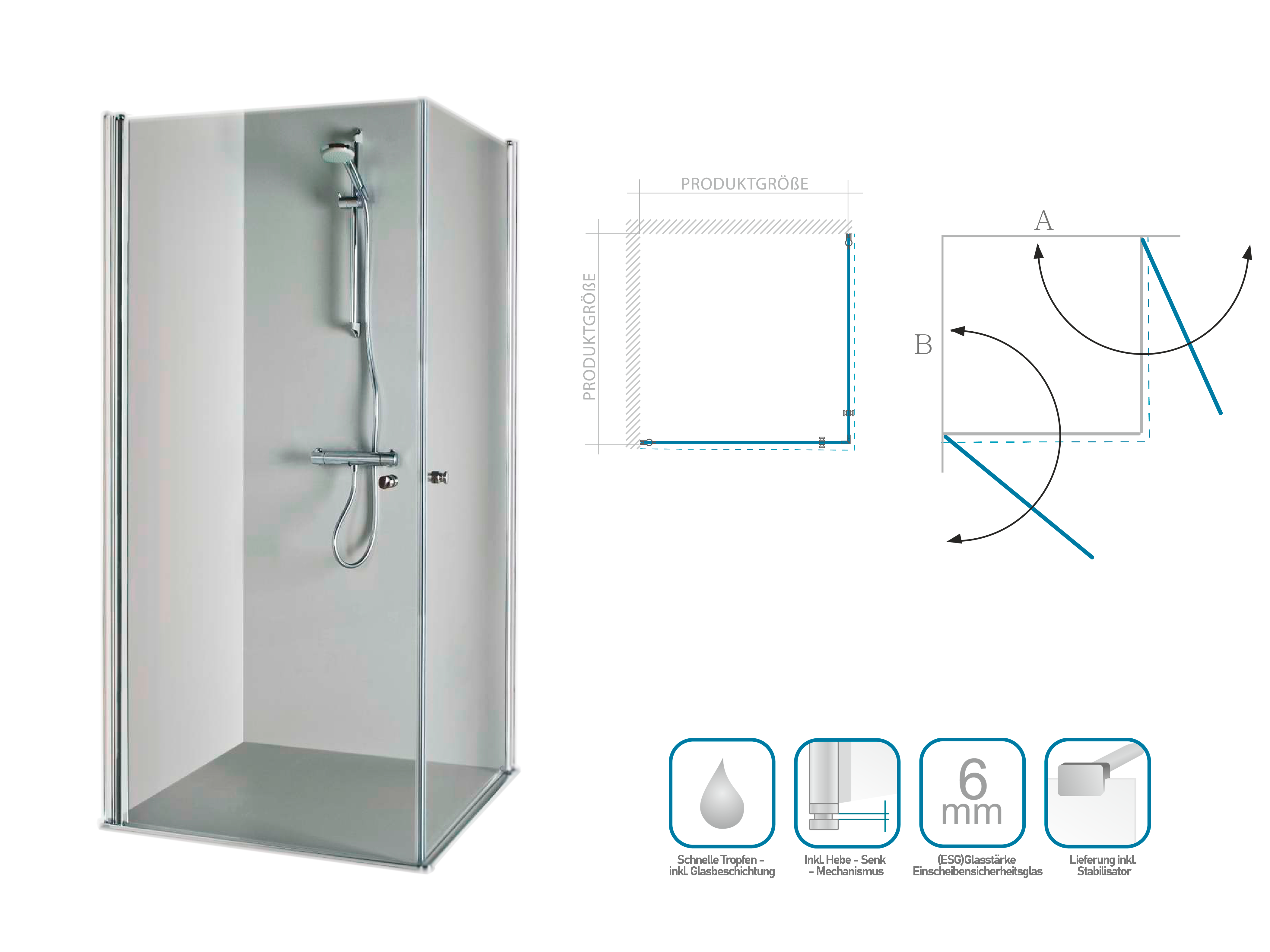Die Pendeltür ist für eine Links-/Rechtsmontage geeignet. Diverse Größen stehen Ihnen über die Artikelvariante zur Verfügung. Die Artikelnummer bezieht sich auf eine Seite, für 1 komplette Eckdusche immer 2 Seiten bestellen.