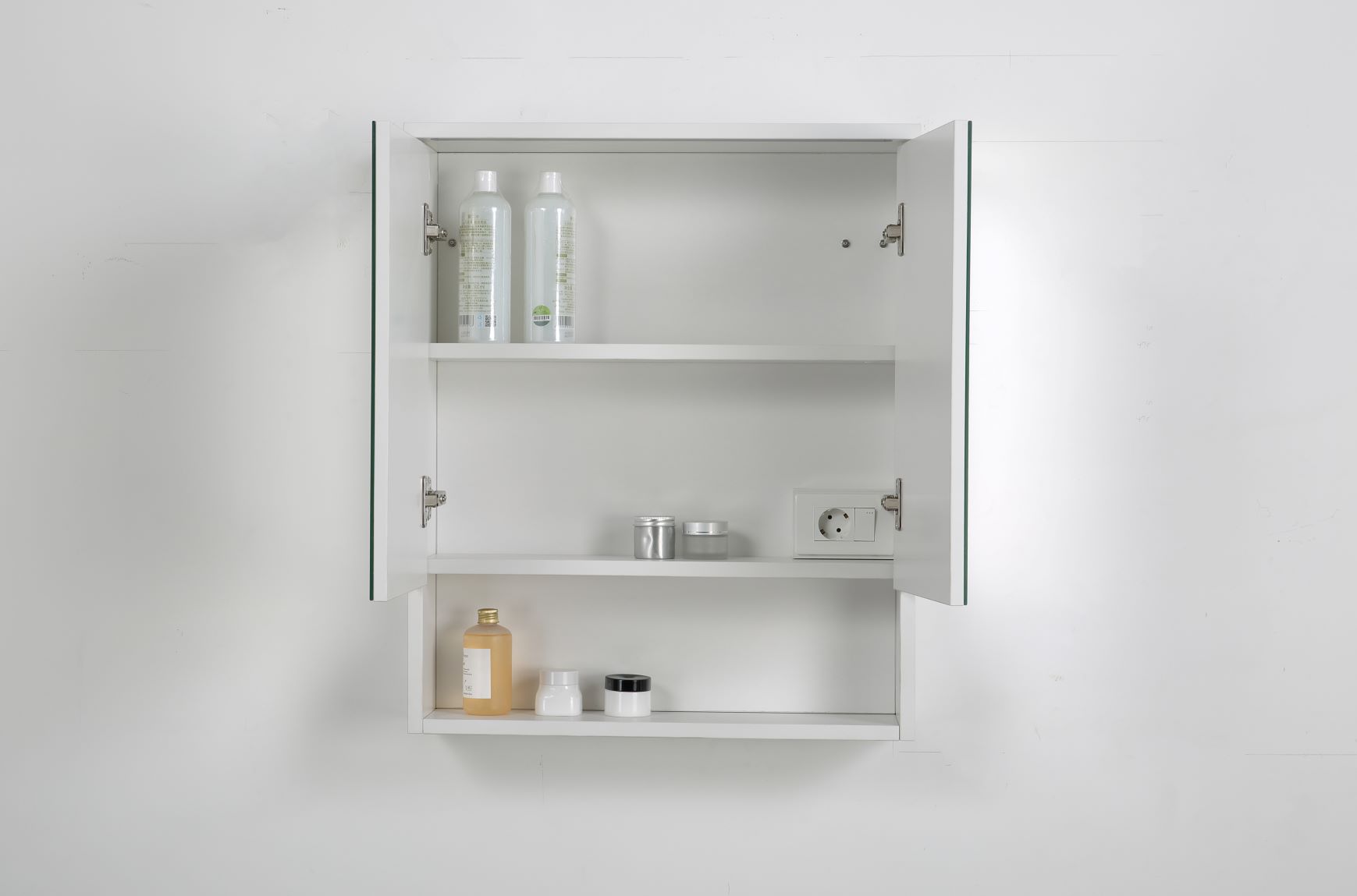 Mit zwei Spiegeltüren ohne sichtbare Griffe fügt sich der Schrank elegant und minimalistisch in die Badezimmereinrichtung ein. Der Innenraum mit einem Einlegeboden und ein integrierter offenen Ablage bieten viel Stauraum für Badutensilien und ermöglichen eine übersichtliche und geordnete Aufbewahrung.