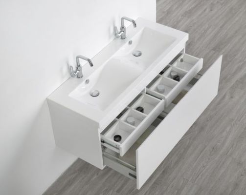 Das Badmöbel-Set überzeugt mit einem Doppel-Waschbecken und einem 120 cm breiten Unterschrank. Die ausziehbaren Schubladen mit 2 kleinen Innenladen bieten Ihnen idealen Stauraum im Bad, wo viele Utensilien Platz finden.