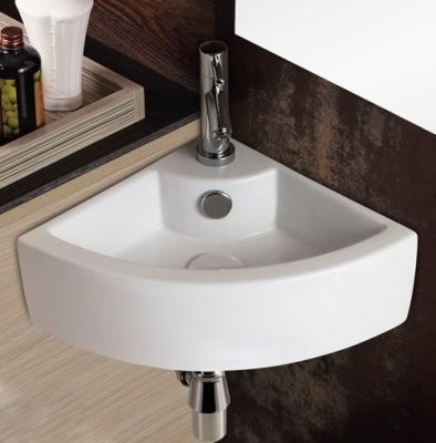 Bei diesem Eckwaschbecken bilden Ecken und Rundungen ein harmonisches Gesamtbild ab. Es kann platzsparend in die Ecke eines kleinen Badezimmers oder Gäste-WCs gehängt werden.