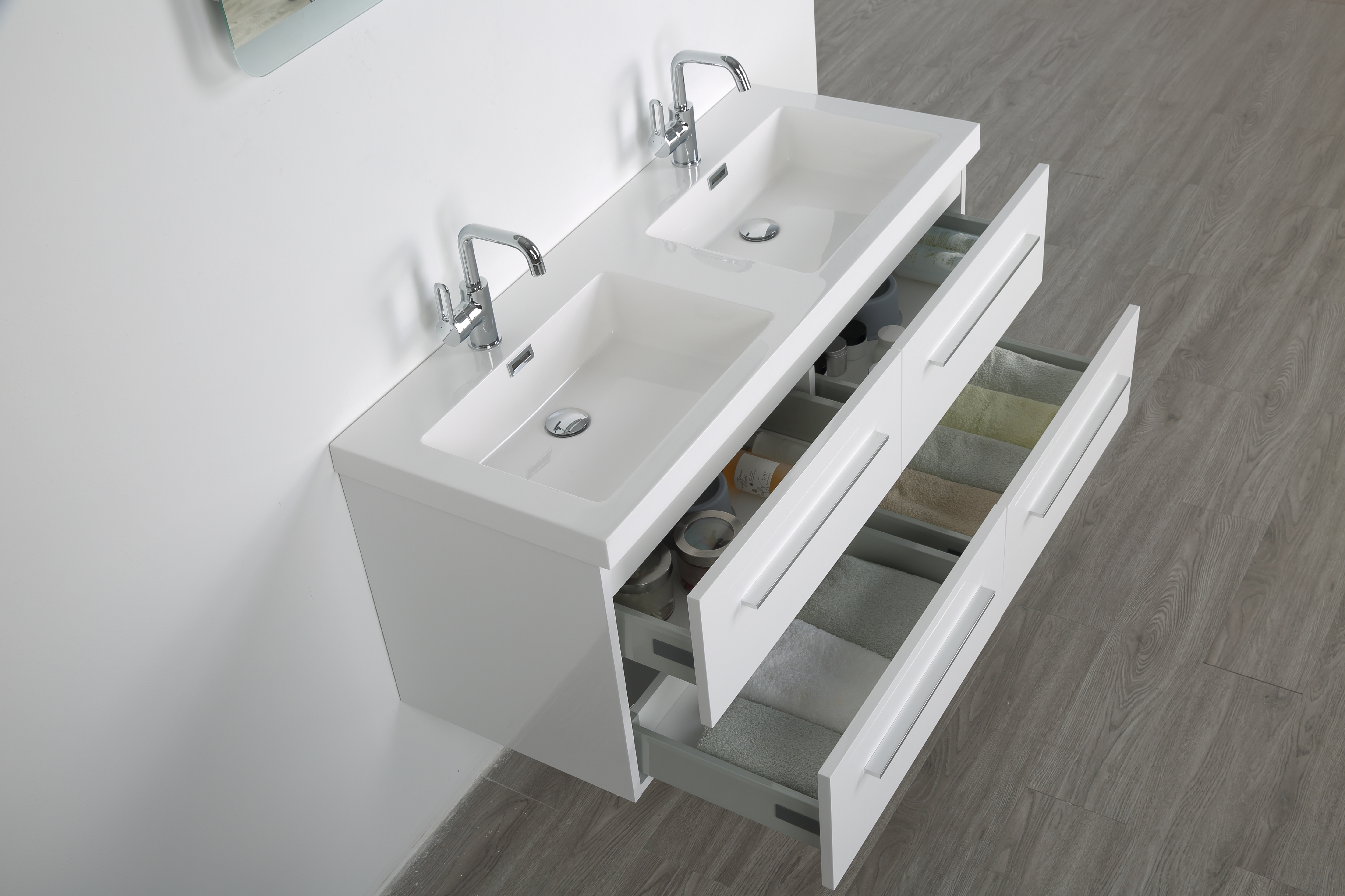 Ausgestattet mit einem hochwertigen Metall-Schubkastensystem, hat der Unterschrank 4 Schubladen mit Soft-Close-Funktion und Aluminium-Griffen, wo viele Utensilien Platz finden. Dank vormontierter Unterschrank ist das Badmöbel-Set einfach und schnell zu installieren.