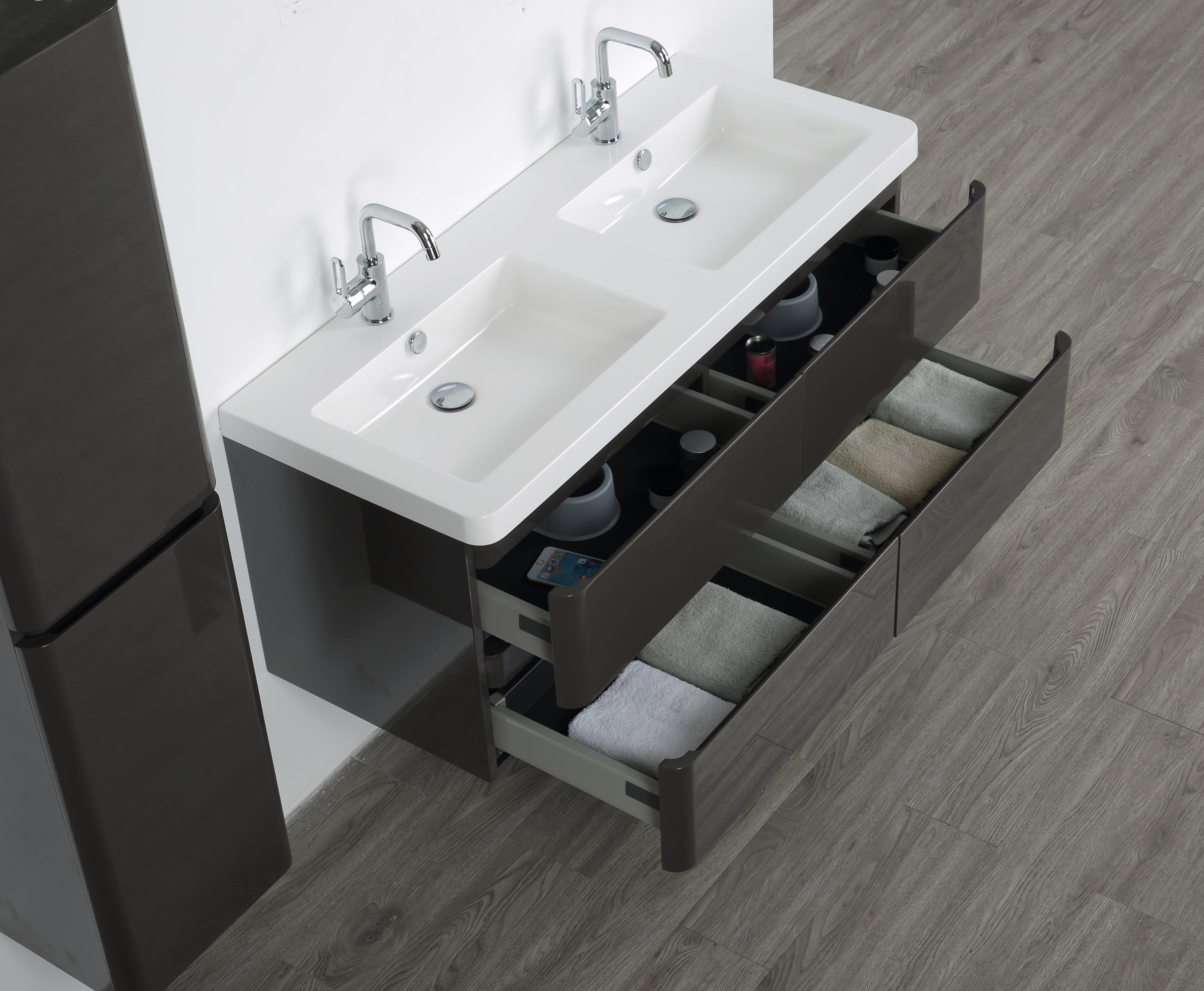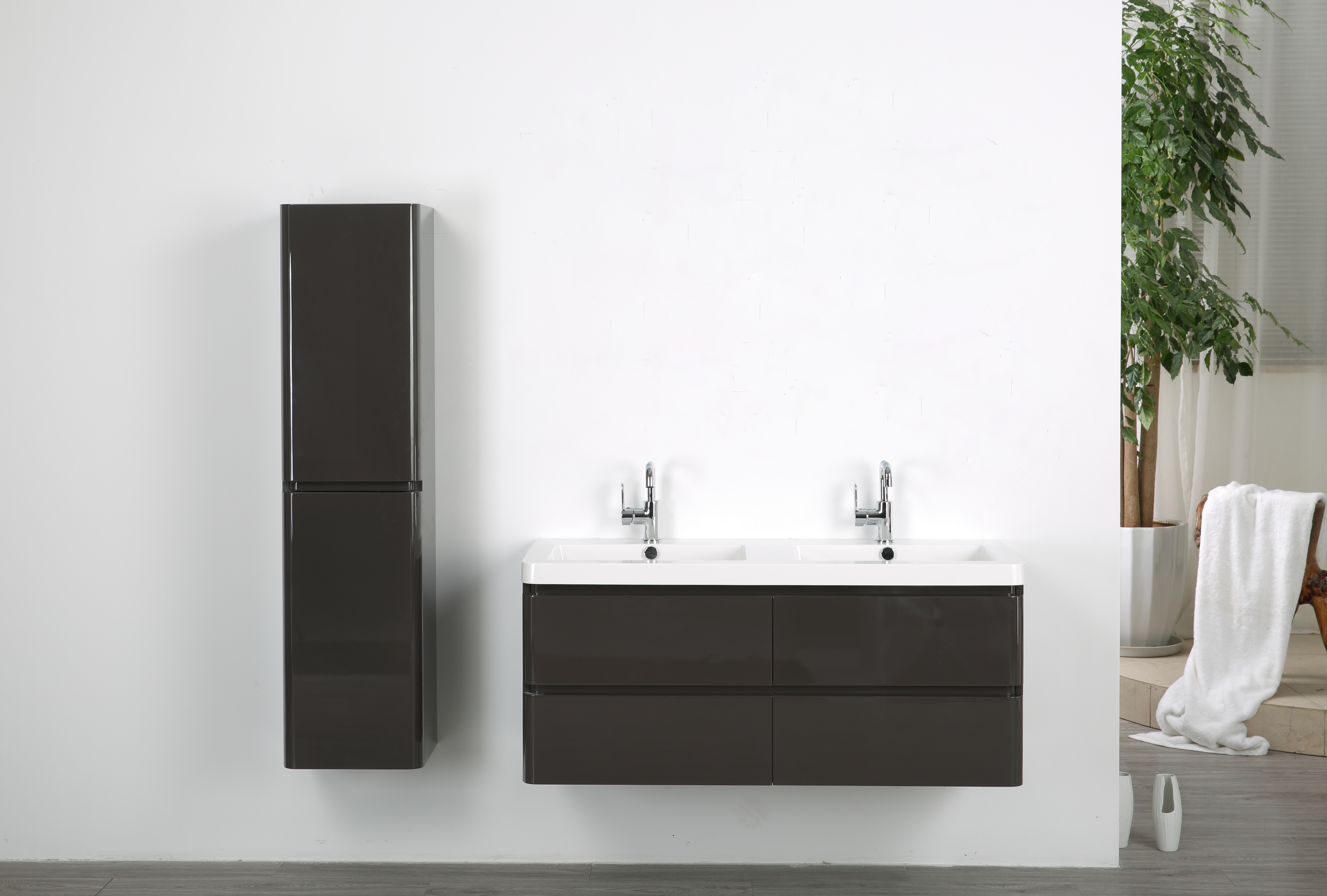 Das Badmöbelunterschrank wird vormontiert in der Größe von 120 cm geliefert und kann problemlos an der Wand angebracht werden. Die Schubladen sind mit hochwertigen Softclose-Scharnieren ausgestattet, die ein sanftes und geräuschloses Öffnen und Schließen ermöglichen.